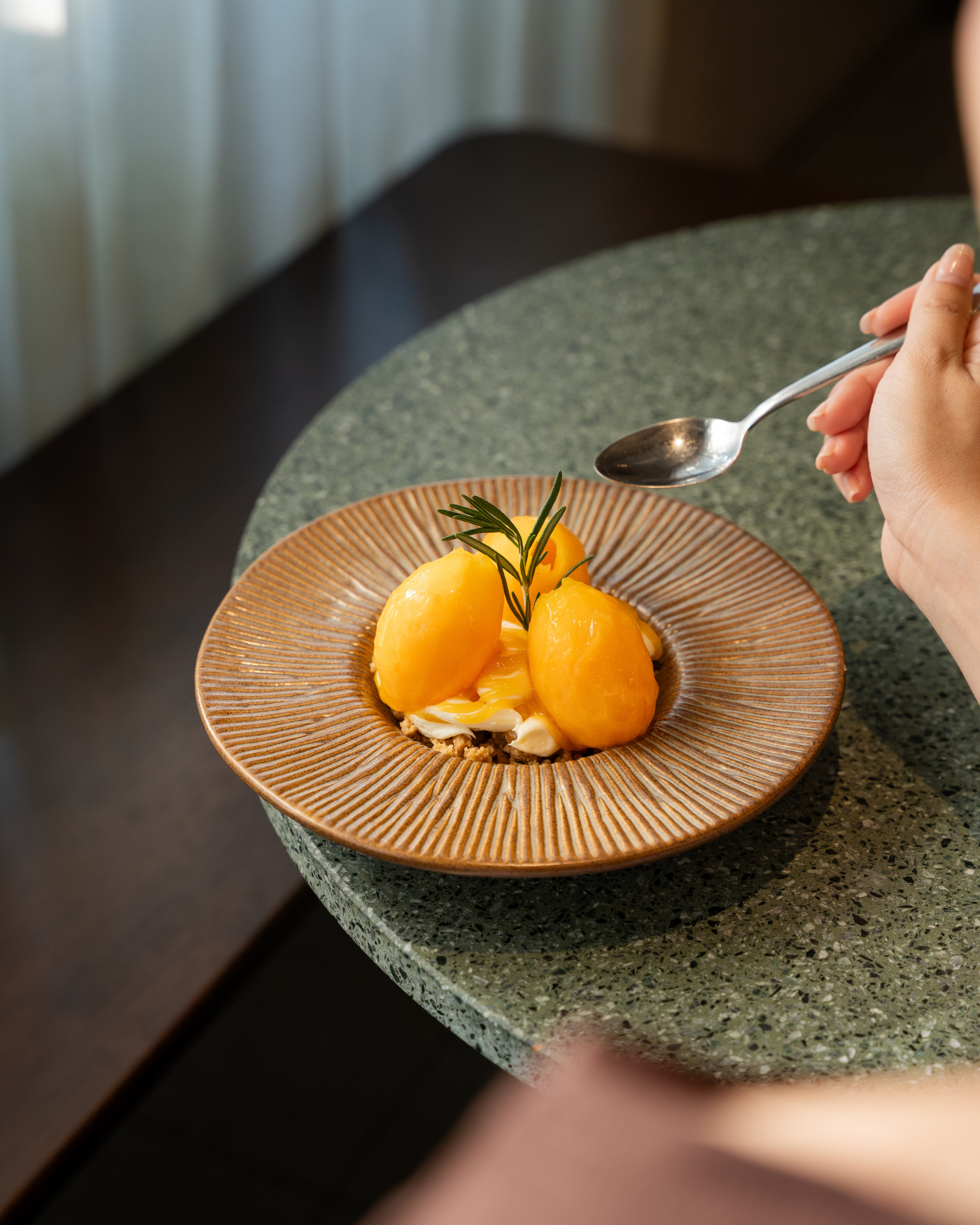 Signature dessert "Mayongchid & chesse" a sweet sour Mayongchid with cream cheese and crumble.