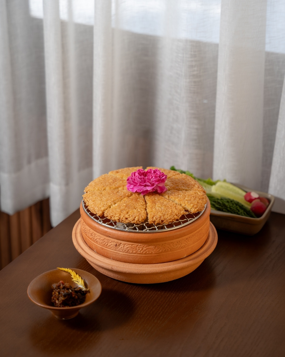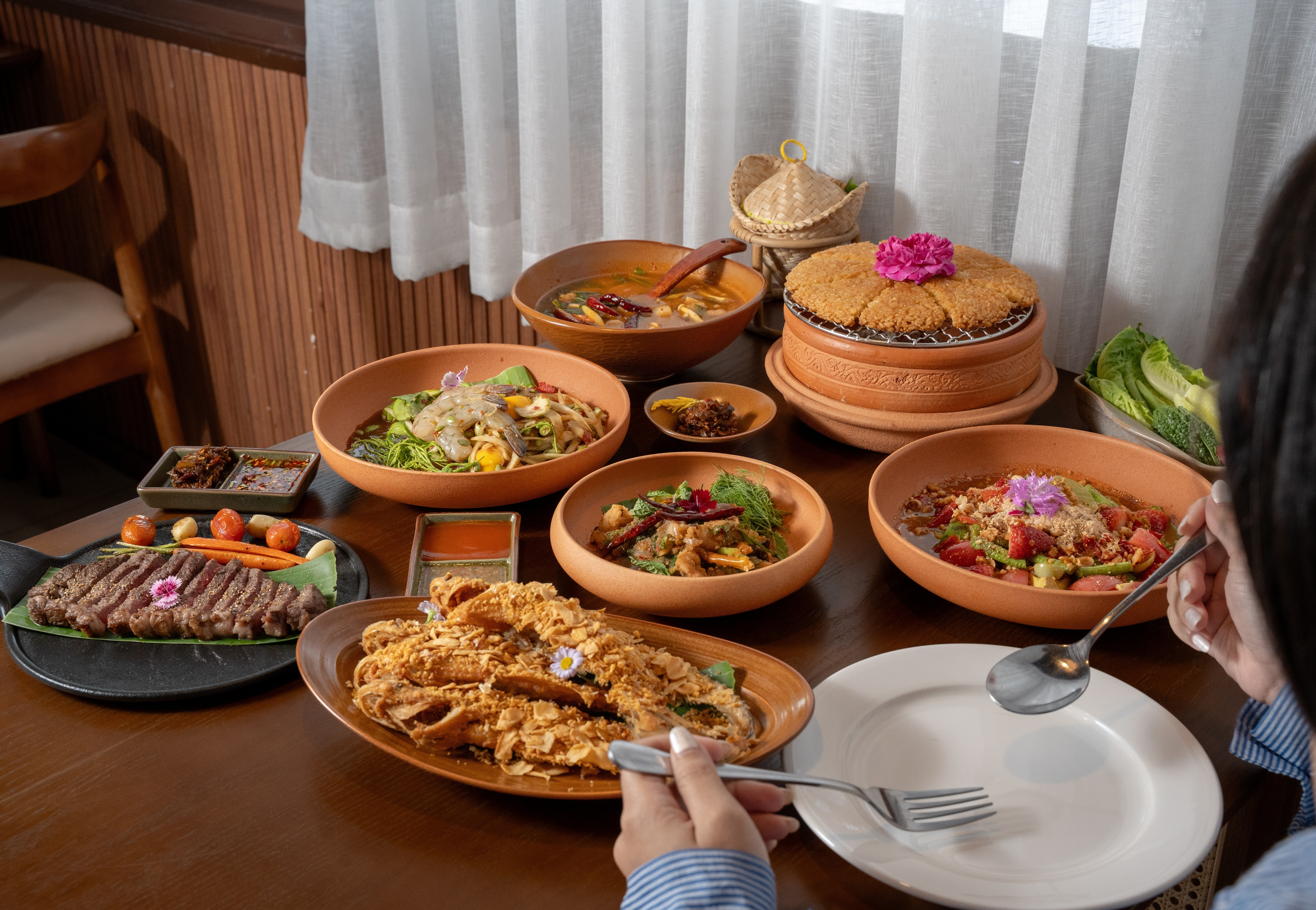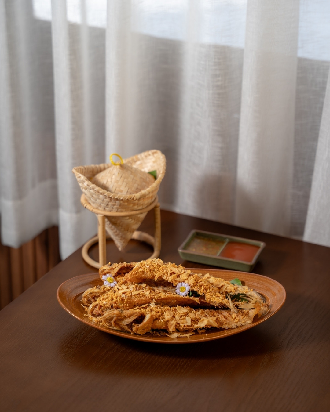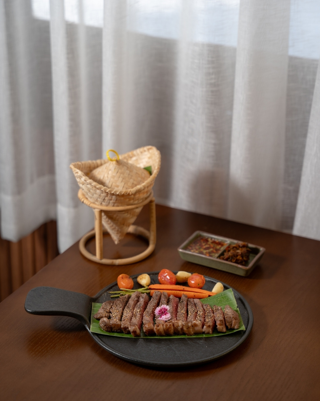 A signature dish of Phala Restaurant, served with Nam Prik Khi Ka (crow chili dip), perfectly blending the rich flavors of Isan cuisine.