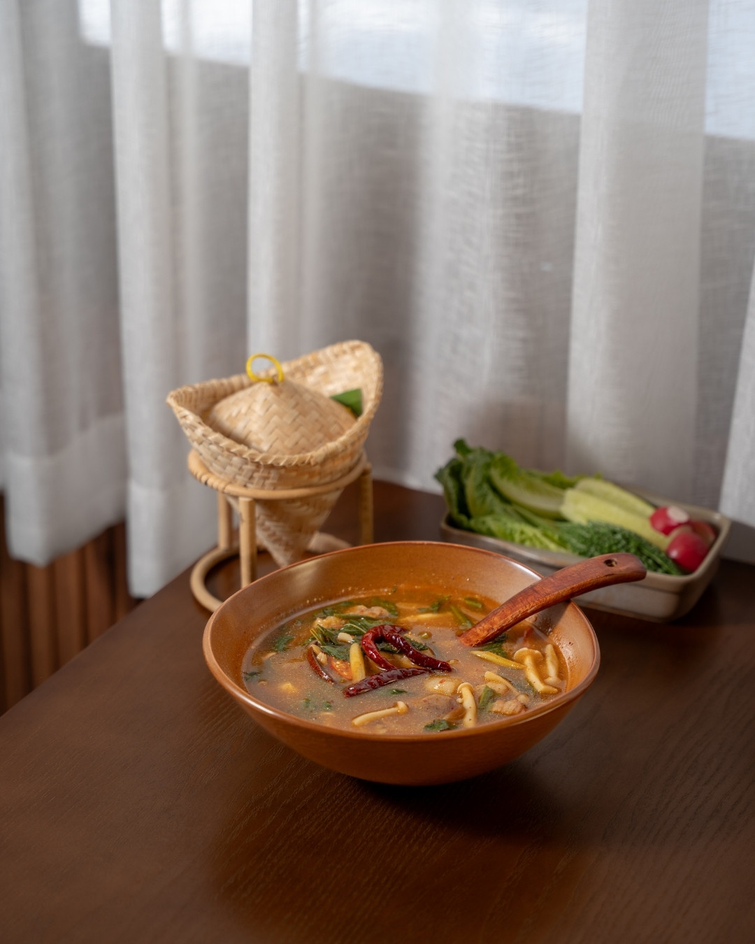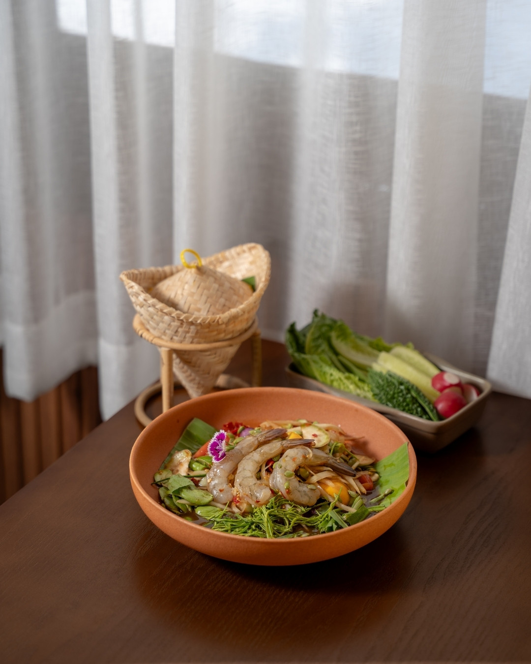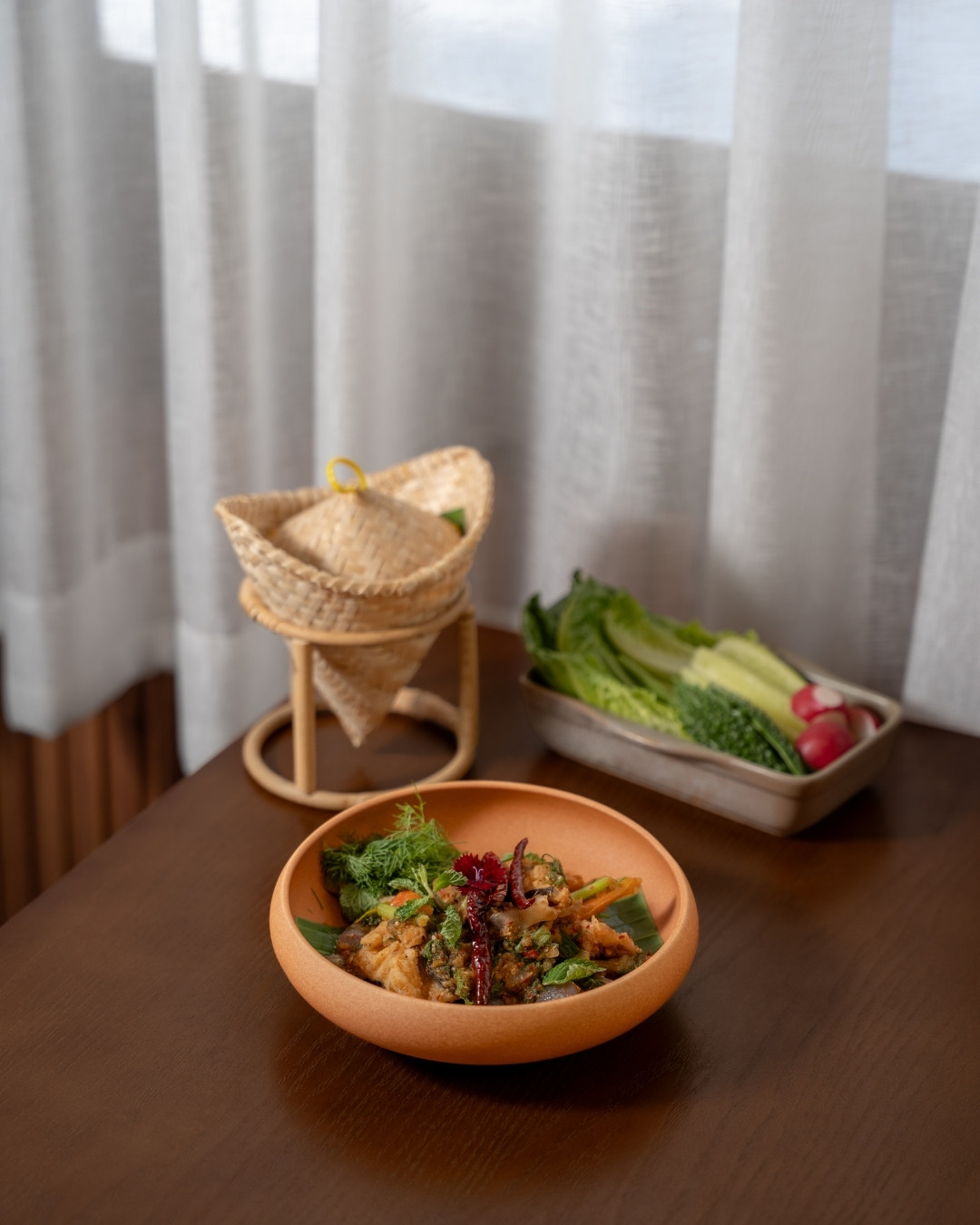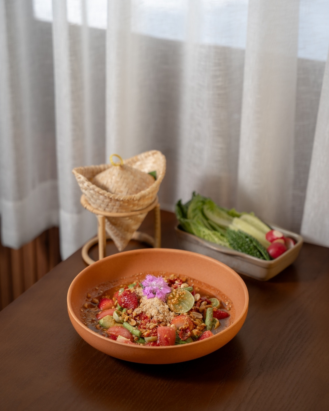 What sets Phala apart from most Isan restaurants in Bangkok is how seriously they take sourcing. The fish here isn't farmed — it's genuine Mekong River fish, brought in directly. The strong current of the Mekong produces fish with firmer, denser flesh and absolutely no fishiness, a quality that's genuinely hard to find in the city. Other ingredients — the avocado, the strawberries — are chosen by variety, not just for appearances. Every choice has a reason behind it, and you can taste the difference. Nothing on the table feels like it was grabbed out of convenience.