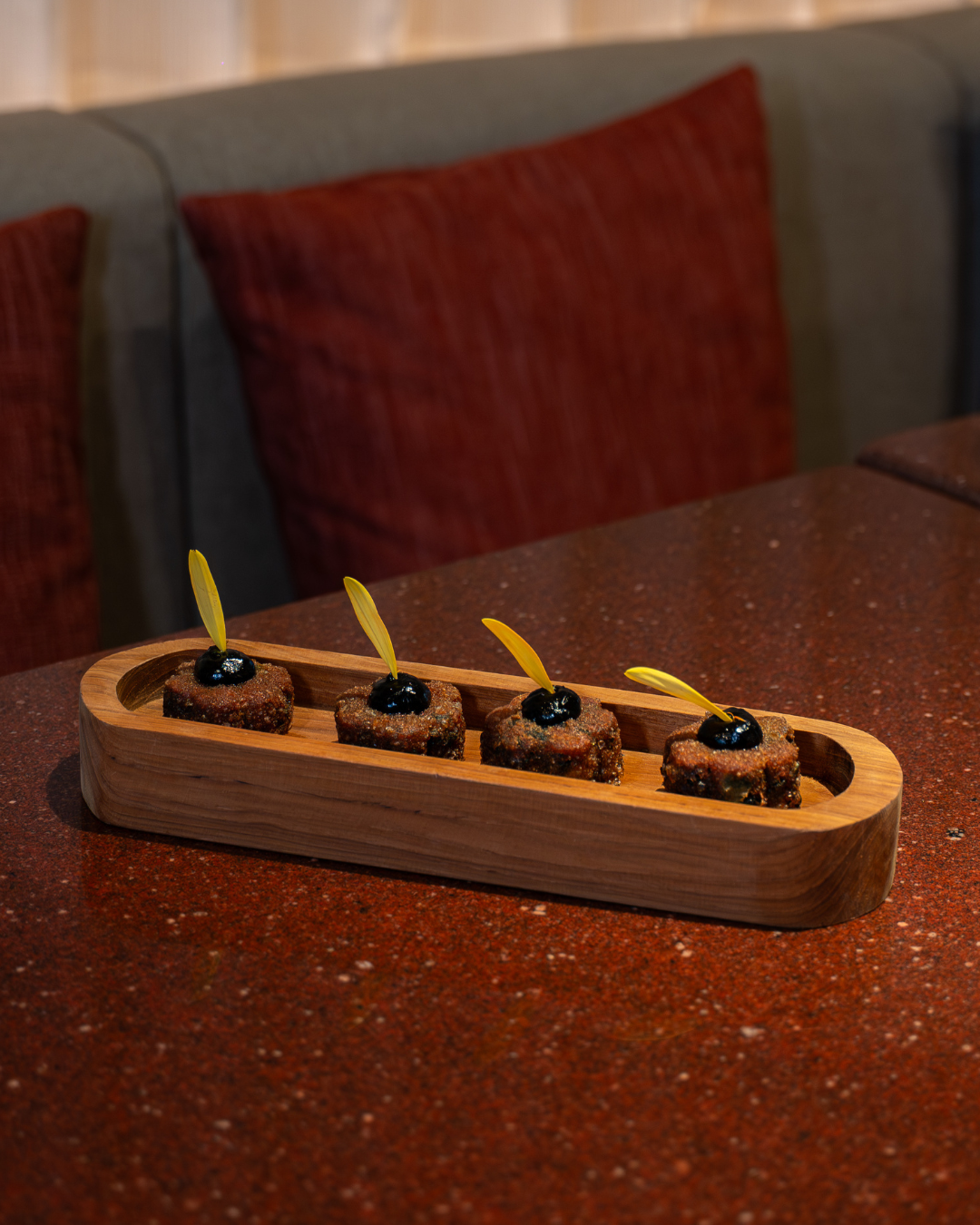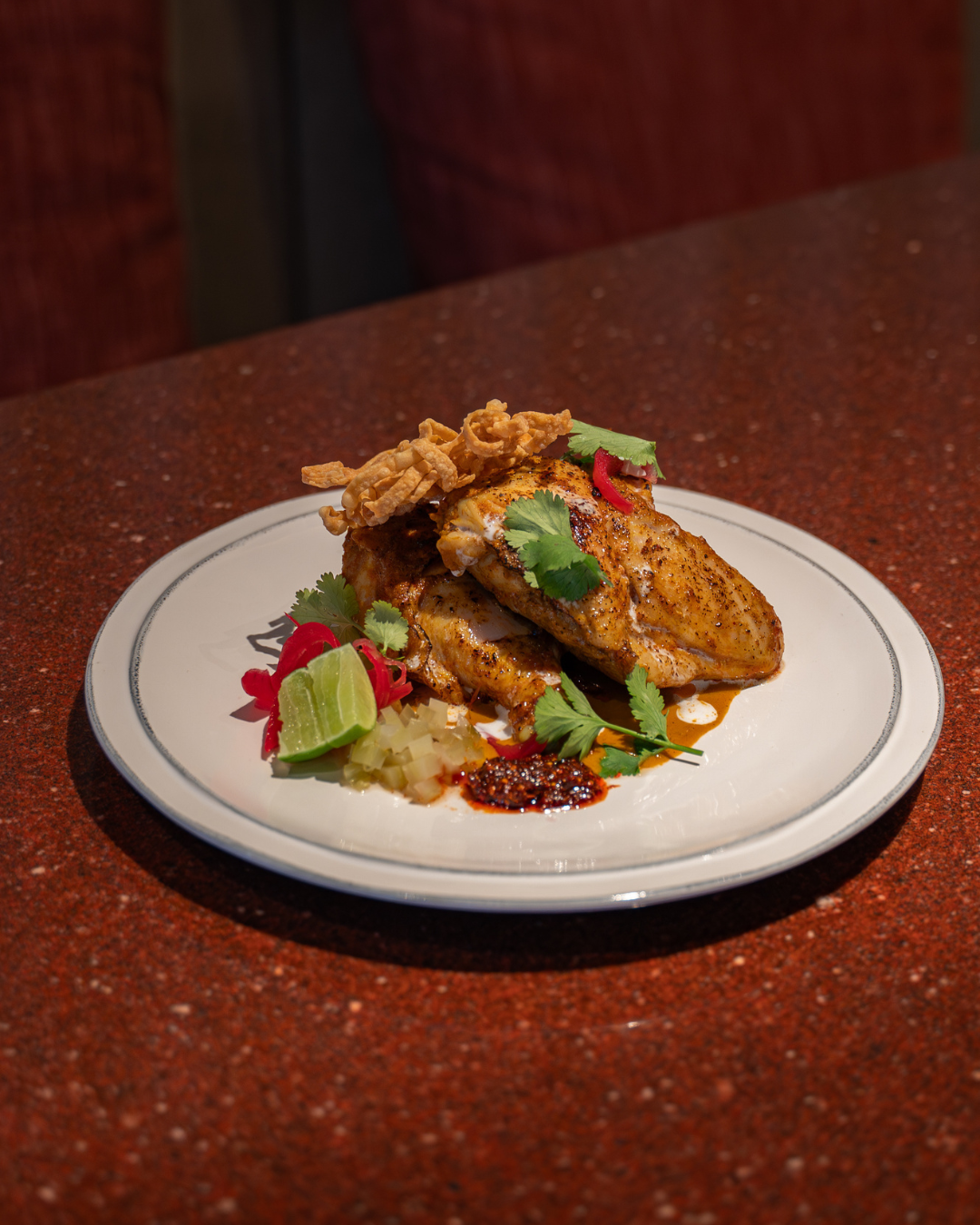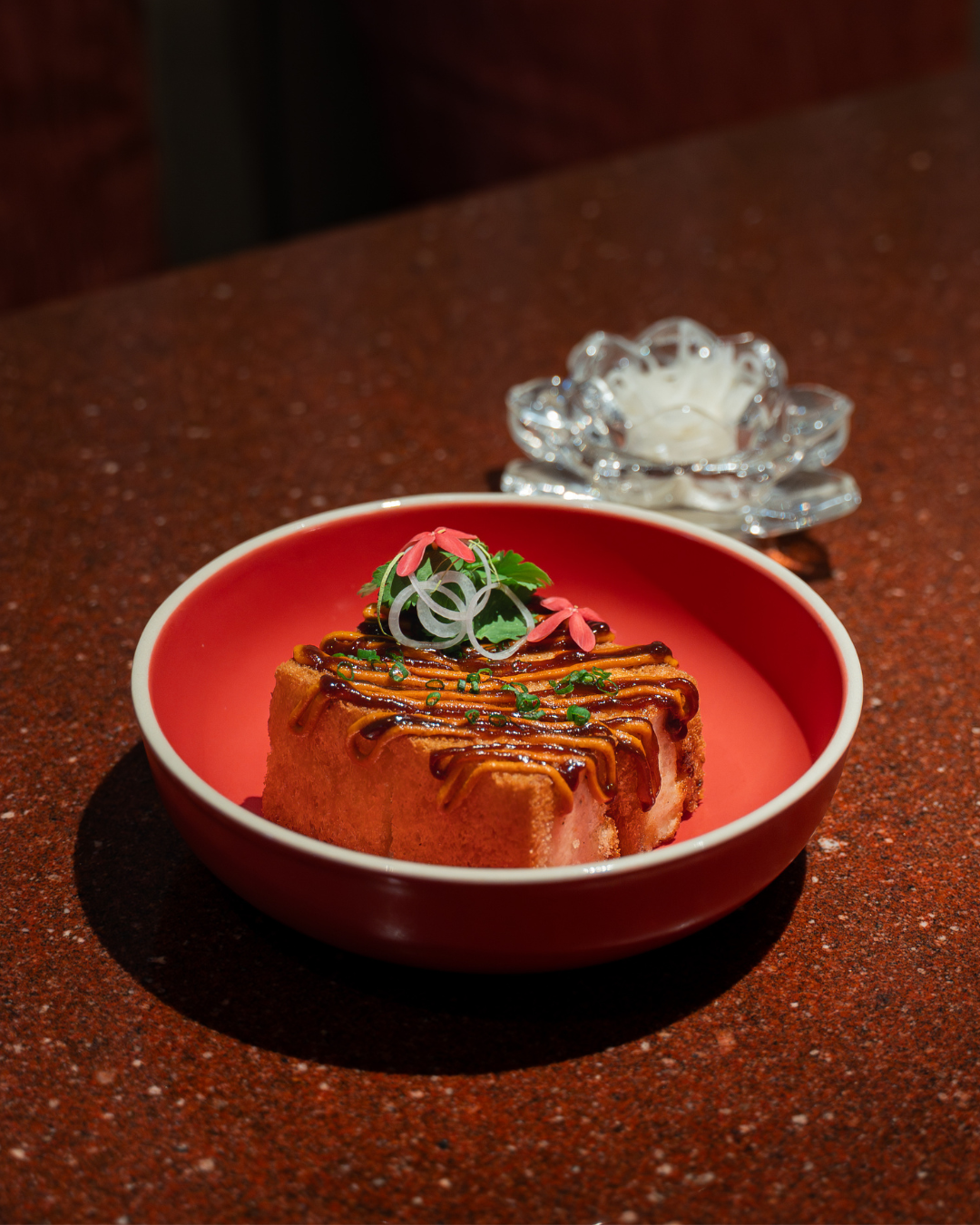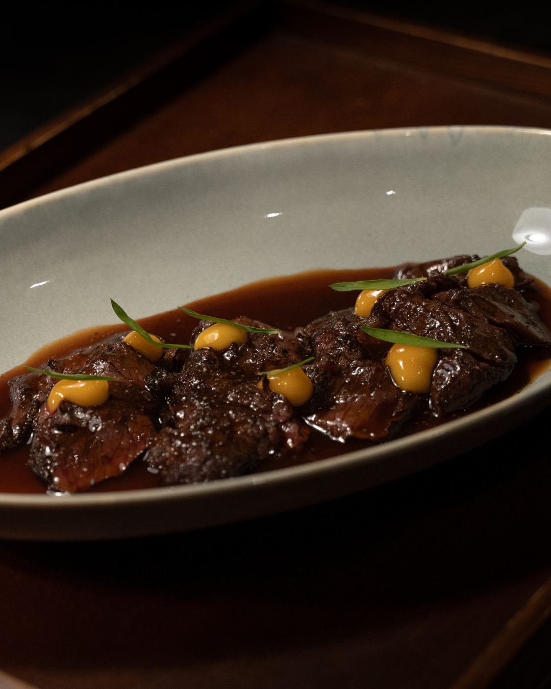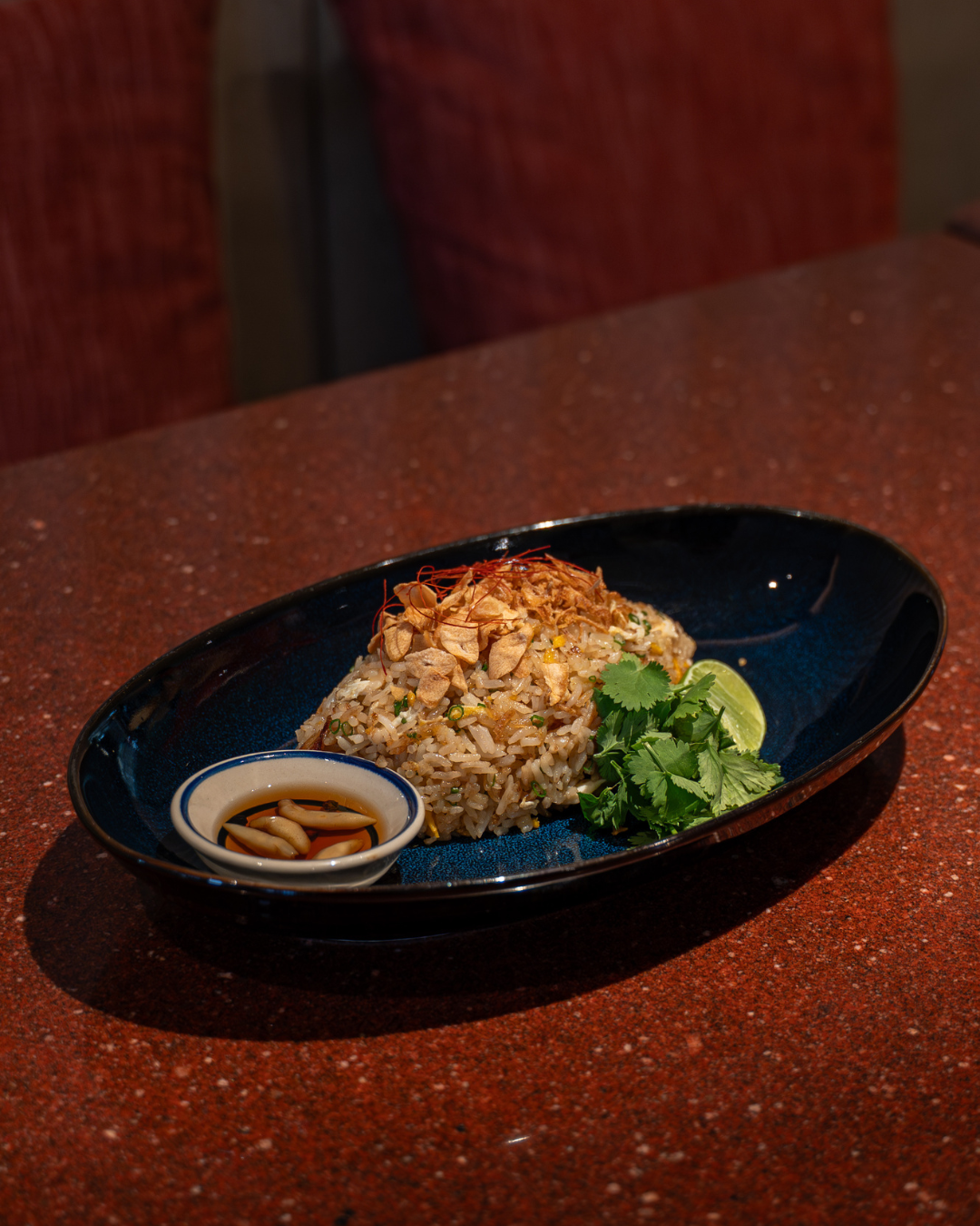 The restaurant’s interior reflects the artistic spirit of its neighborhood. Designed with mid-century influences and industrial elements inspired by Talad Noi’s heritage, the space balances modern aesthetics with warmth and comfort. An open kitchen further enhances the experience, allowing diners to connect with the craftsmanship behind every plate.