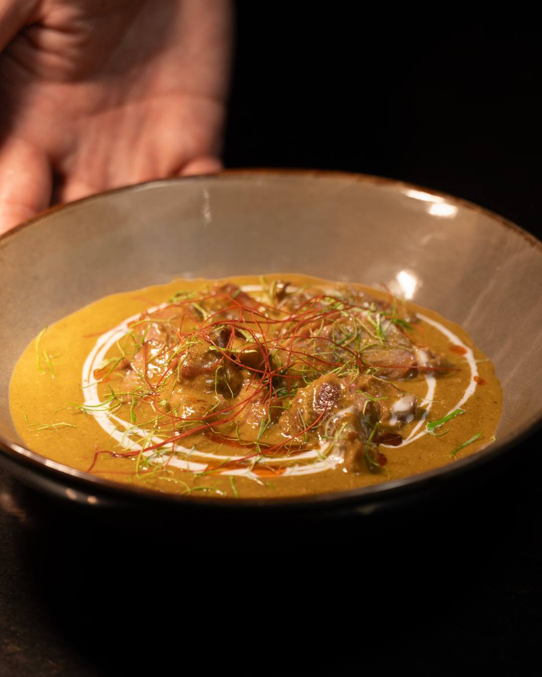 Tender grilled pork cheek with smoky aroma, paired with a traditional cassia leaf curry
