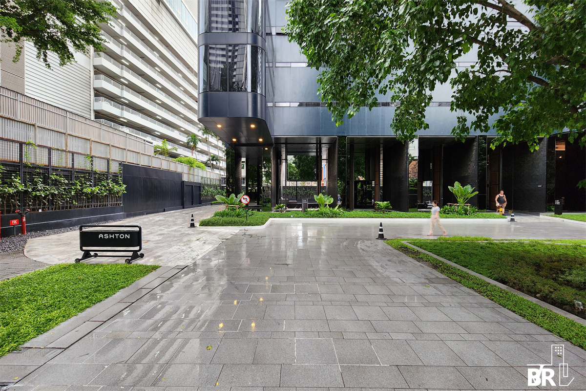 What I find most charming about the entrance is how they preserved the massive original trees on the plot. It creates a "green tunnel" effect that buffers the building from the chaos of Asoke road.